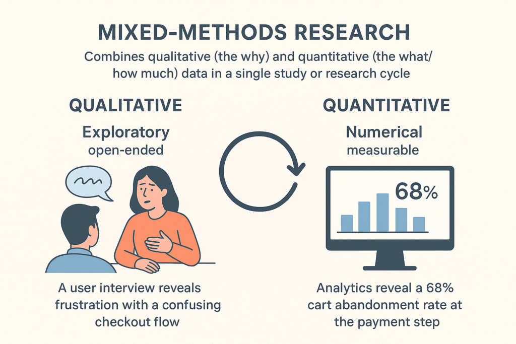 Mixed-methods research combines qualitative (the why) and quantitative (the what/how much) data in a single study or research cycle.